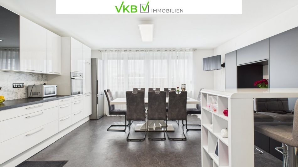 Der große lichtdurchflutete Koch/Essbereich, mit imposanter Einbauküche aus dem Hause DAN-Küchen und der angrenzenden Bartheke ist nur einer von vielen Höhepunkten, die diese Wohnung zur besonderen Art und Weise macht.