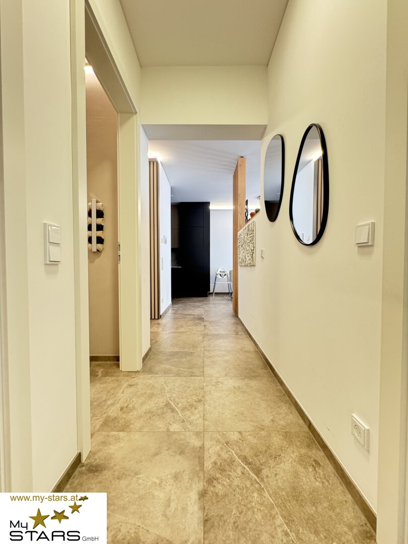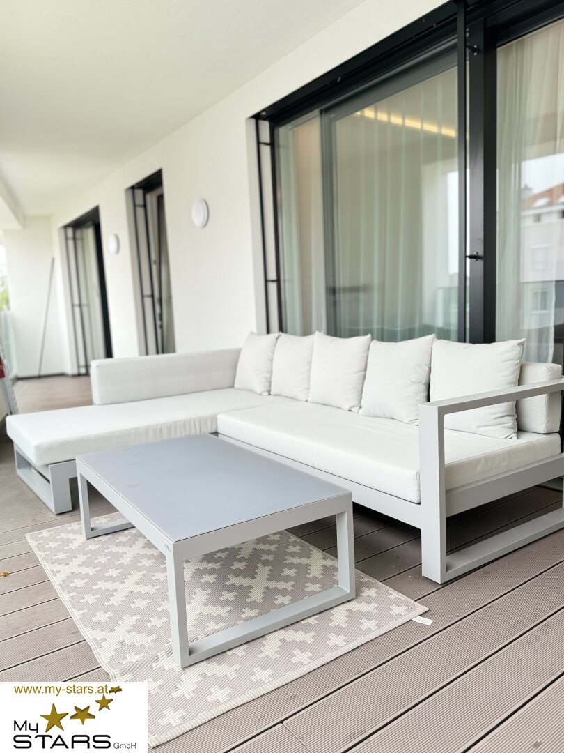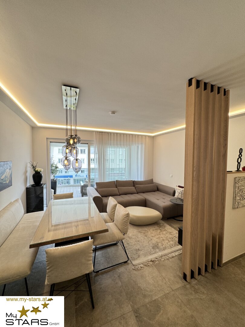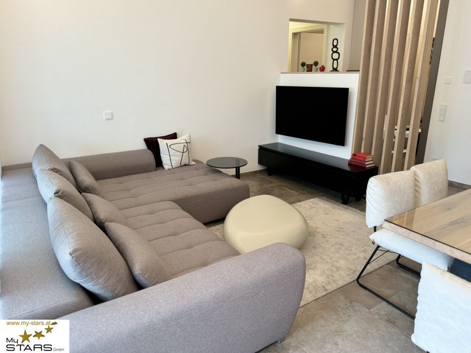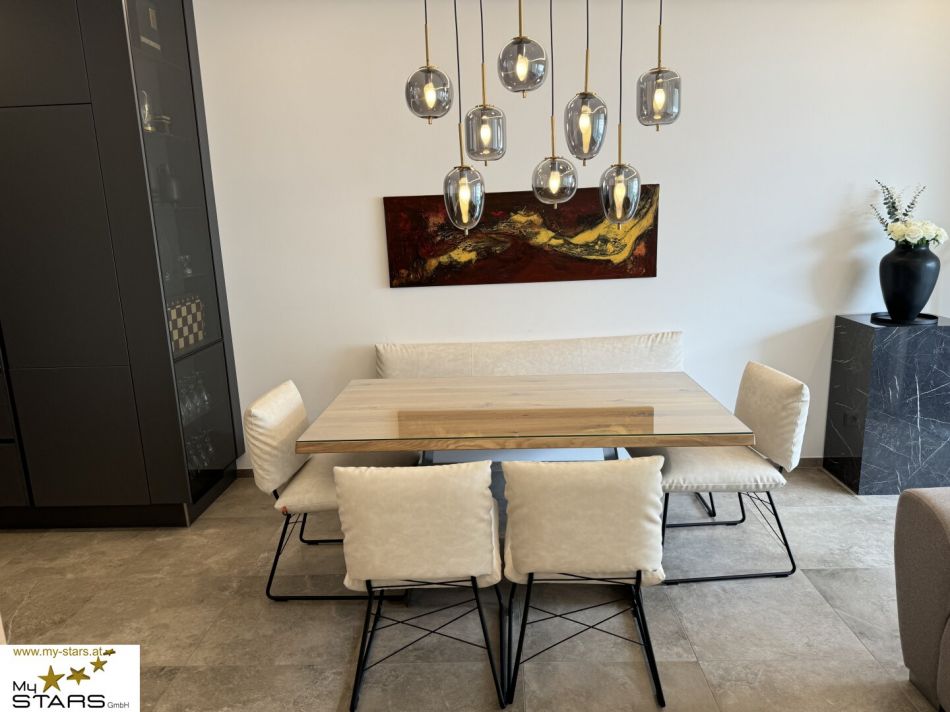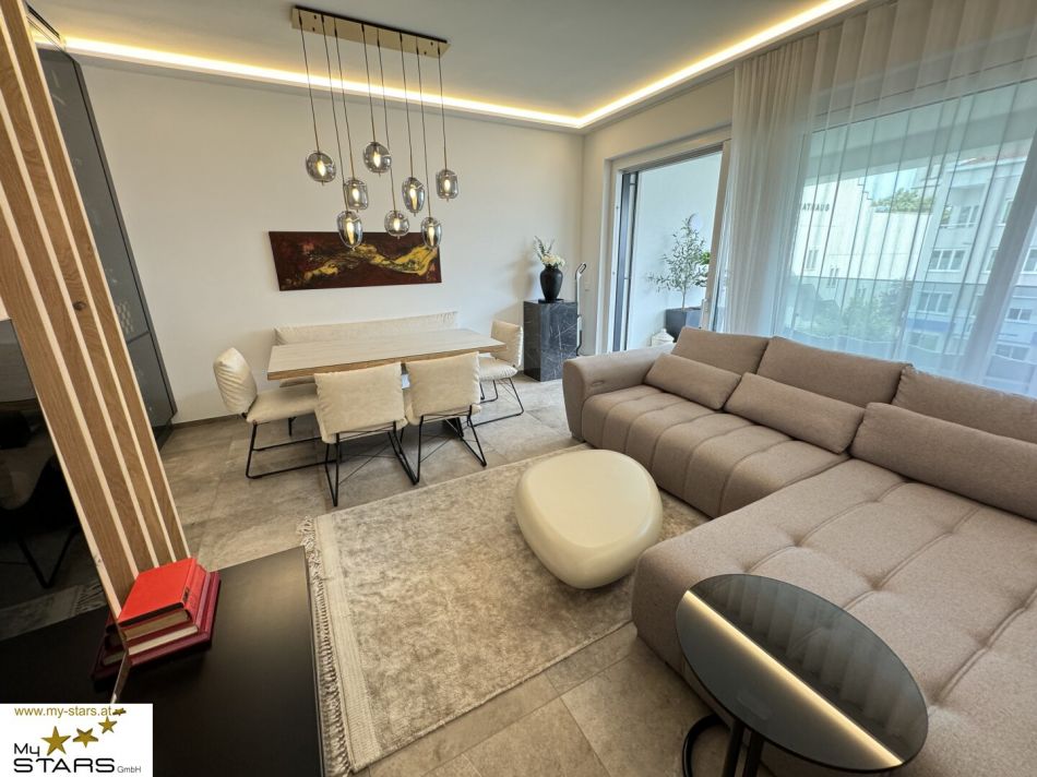 Beim Betreten der Wohnung werden Sie sofort von der modernen und neuwertigen Ausstattung begeistert sein, welche vor allem durch die maßgeschneiderten Möbel überzeugt. Der großzügige Wohn- und Essbereich ist mit hochwertigen, italienischen Naturfliesen ausgestattet und bietet genügend Platz für gemütliche Stunden mit Freunden und Familie, welche man ebenso auf der großen Loggia genießen kann. Durch die bodentiefen Fenster wird der Wohnbereich mit genügend Lichtstrahlen versorgt.