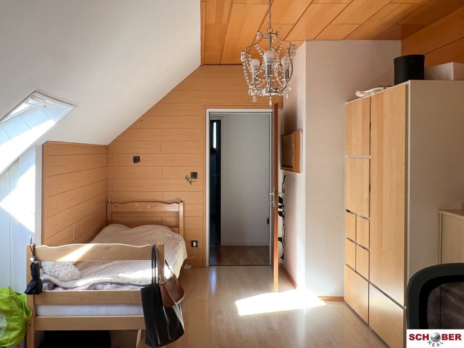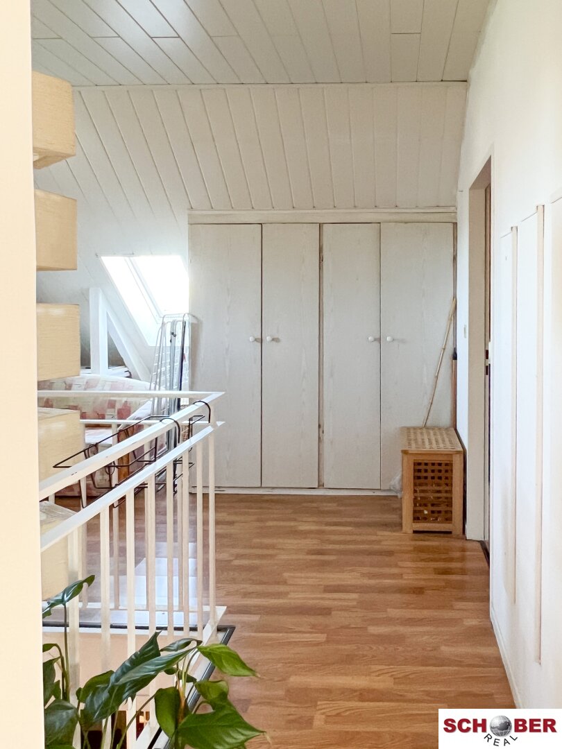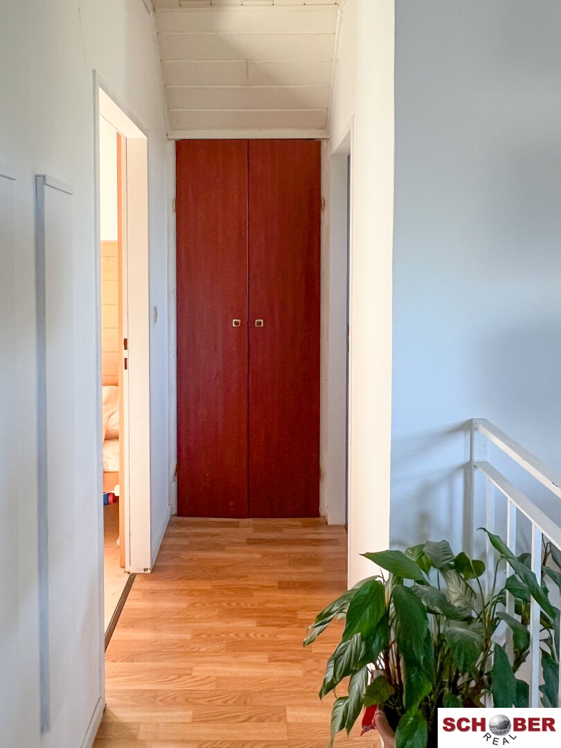 Über eine schöne Treppe gelangen Sie in das Obergeschoss, das mit einem großzügigen, lichtdurchfluteten Vorraum und viel Stauraum punktet. Auf dieser Ebene befinden sich zwei weitere Schlafzimmer, ein großes Tageslicht-Badezimmer mit Wanne und WC sowie eine verglaste Loggia, die von beiden Schlafzimmern aus zugänglich ist.