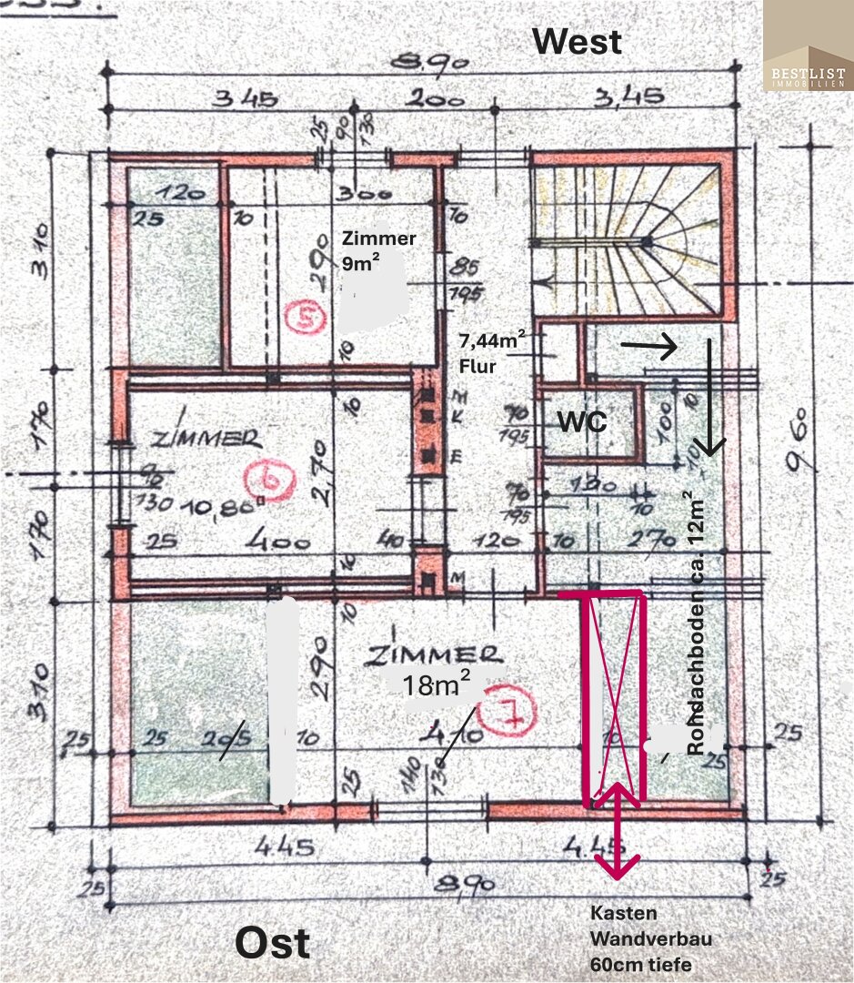 8 Zimmer, 2 Bäder mit Toilette, plus 1 Gästetoilette