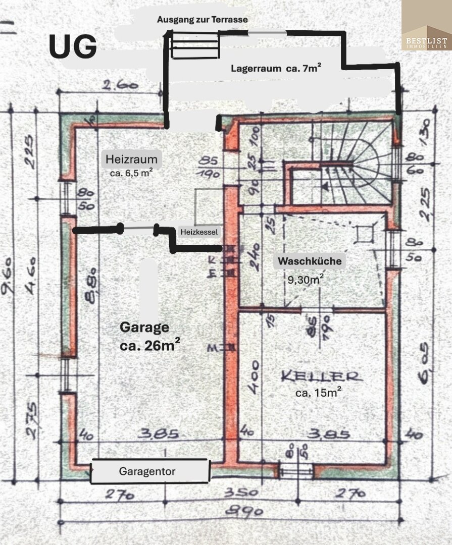 Untergeschoss Garage und Keller: ca. 66,5 m² (Heizraum Heizkessel Vaillant VKS 26E Einbaujahr nicht bekannt, Waschraum, zwei Einlagerungsräume davon einer mit direktem Ausgang auf die Terrasse, sowie die ca. 26m² große Garage mit elektrischen Garagentor Einbaujahr 2022)
