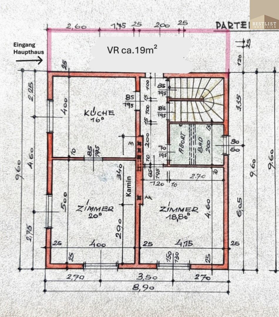 EG Haus: ca. 83 m² (Vorraum, Küche 16 m² plus 2 Zimmer, 19 m² und 20 m²)