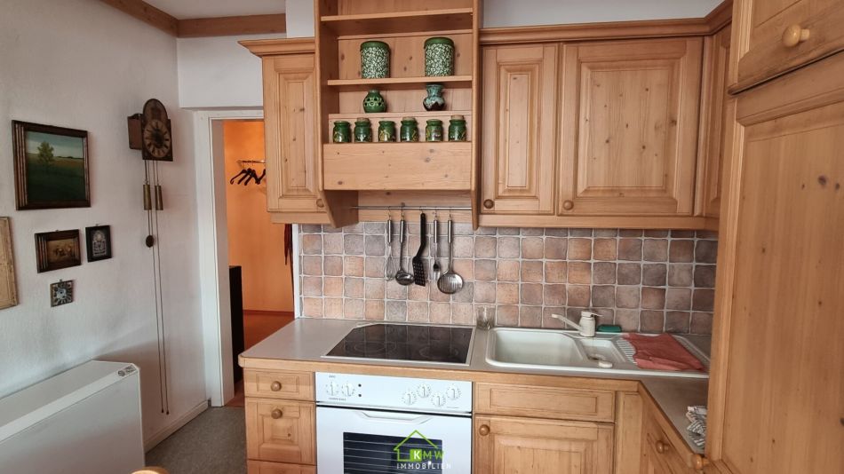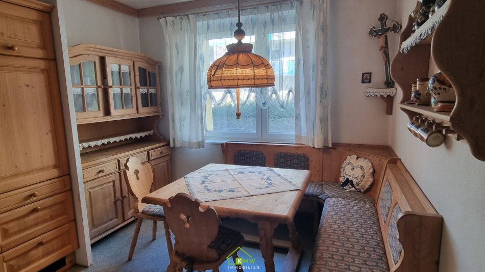 Die Küche ist mit Holzmöbeln vom Tischler sowie einer gepolsterten Eckbank ausgestattet.