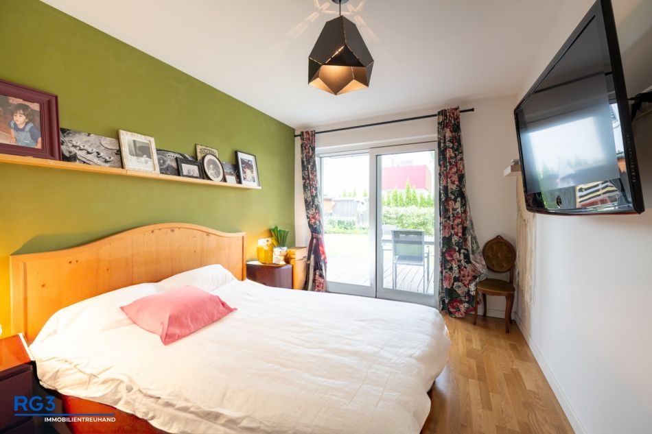 Links führt der Flur in das erste Zimmer, ideal als Arbeits- oder Kinderzimmer nutzbar, danach folgt das großzügige Schlafzimmer. Beide Räume bieten direkten Zugang zum Garten – ebenso wie das helle Wohnzimmer mit moderner Küche und angrenzender Speis