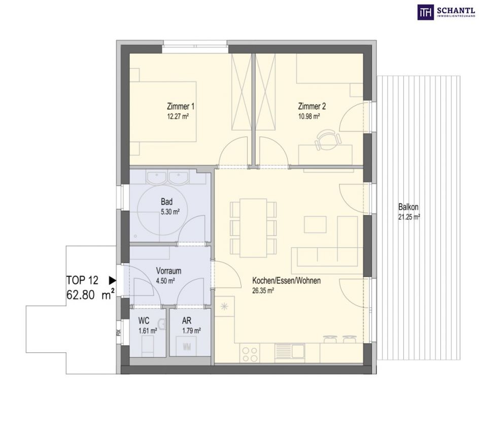 62,80 m² Wohnfläche + 21,25 m² Südostbalkon