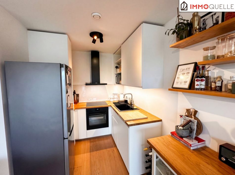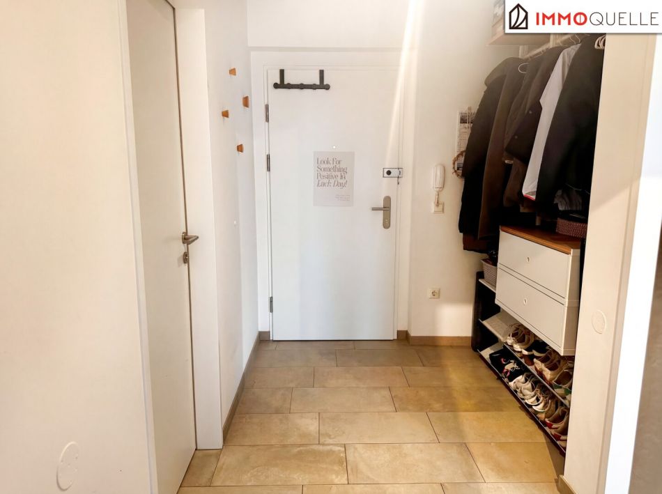 Zur linken Seite öffnet sich der Wohnbereich - und damit das Herzstück der Wohnung. Auf 25,95 m² vereinen sich Wohnen, Essen und Kochen zu einem offenen, luftigen Mittelpunkt des täglichen Lebens. Die vorhandene Einbauküche fügt sich harmonisch in den Raum ein und macht die Wohnung vom ersten Moment an alltagstauglich. Direkt neben der Küche ergänzt ein praktischer Abstellraum das Raumangebot und schafft wertvollen Stauraum dort, wo man ihn wirklich braucht.