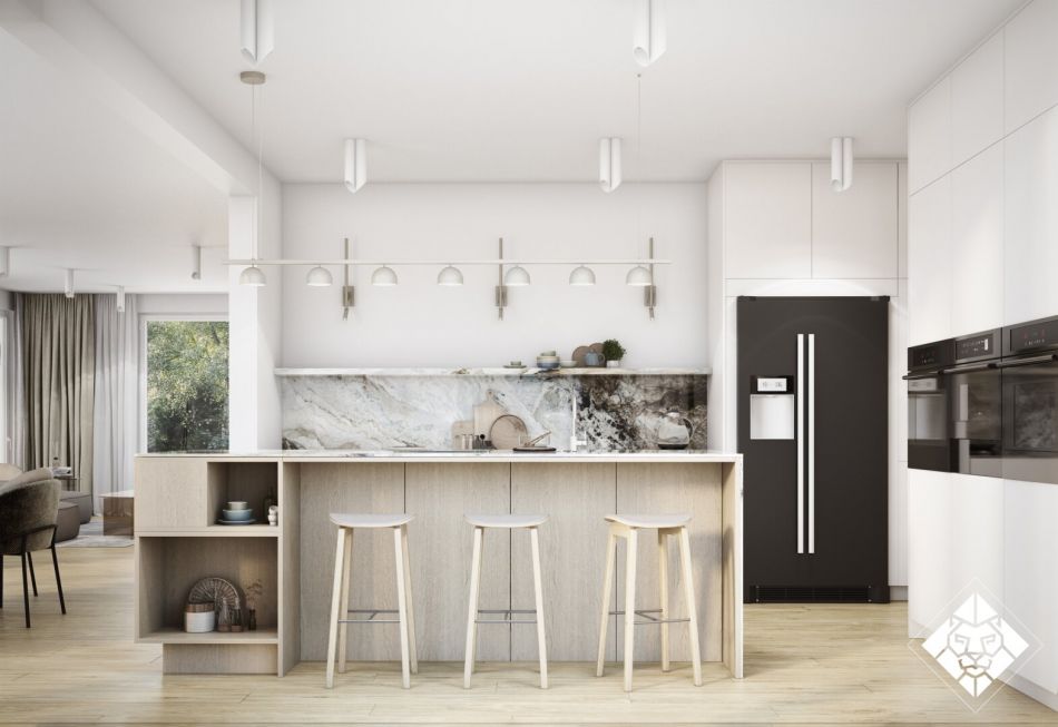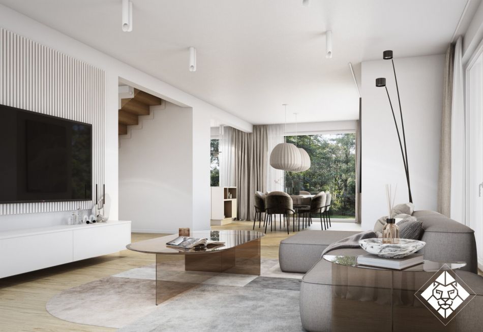 Der offene Wohnbereich ist auf Großzügigkeit und Naturbezug ausgelegt. Große Fensterflächen sorgen für optimalen Lichteinfall und einen freien Blick ins Grüne. Küche, Essen und Wohnen verbinden sich zu einem harmonischen Raum, der nach Südwesten orientiert ist.