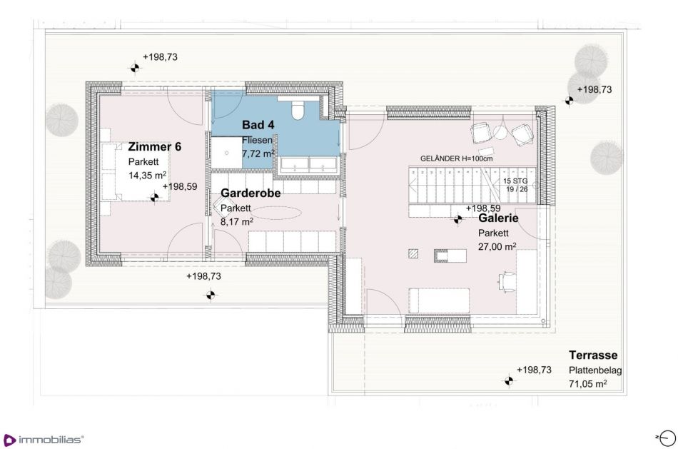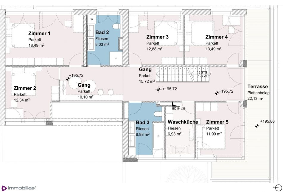 Südterrasse, ca 22,12 m², vom Gang sowie Schlafzimmer 4 und 5 aus zu betreten
