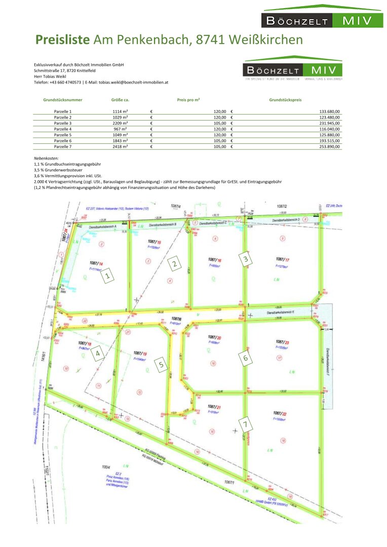 Sie sind schon länger auf der Suche nach einem passenden Baugrundstück für sich selbst und Ihre Liebsten? Dann sind Sie hier genau richtig! Insgesamt werden 7 Grundstücke in einer Größe von ca. 967 m² bis 2.418 m² aufgeschlossen und stehen zum Verkauf!Der neu aufgeschloissene Siedlungsteil befindet sich "Am Penkenbach" in der Gemeinde Weißkirchen und bietet künftigen Eigentümern neben einer absoluten Ruhelage auch bis zu 14 Sonnenstunden in den Sommermonaten. Sämtliche Grundstücke sind als allgemeines Wohngebiet mit einer Dichte von 0,2 - 0,4 (WA 0,2 - 0,4) gewidmet, womit sich praktisch jedes Einfamilienprojekt realisieren lässt. Auch hinsichtlich der Dachformen gibt es großen Planungsspielraum für künftige Häuslbauer: Es sind Satteldächer (Neigung zwischen 30° und 45°) sowie Walmdächer (Neigung zwischen 20° und 30°) oder auch Flachdächer (Neigung bis max. 10°) zulässig. Genauere Informationen entnehmen Sie bitte dem Bebauungsplan den wir Ihnen auf Anfrage gerne zukommen lassen!
