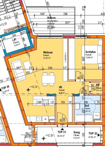 - Vorraum - Wohn/Ess/Küche - Bad mit WC - Abstellraum - Schlafzimmer - Balkon