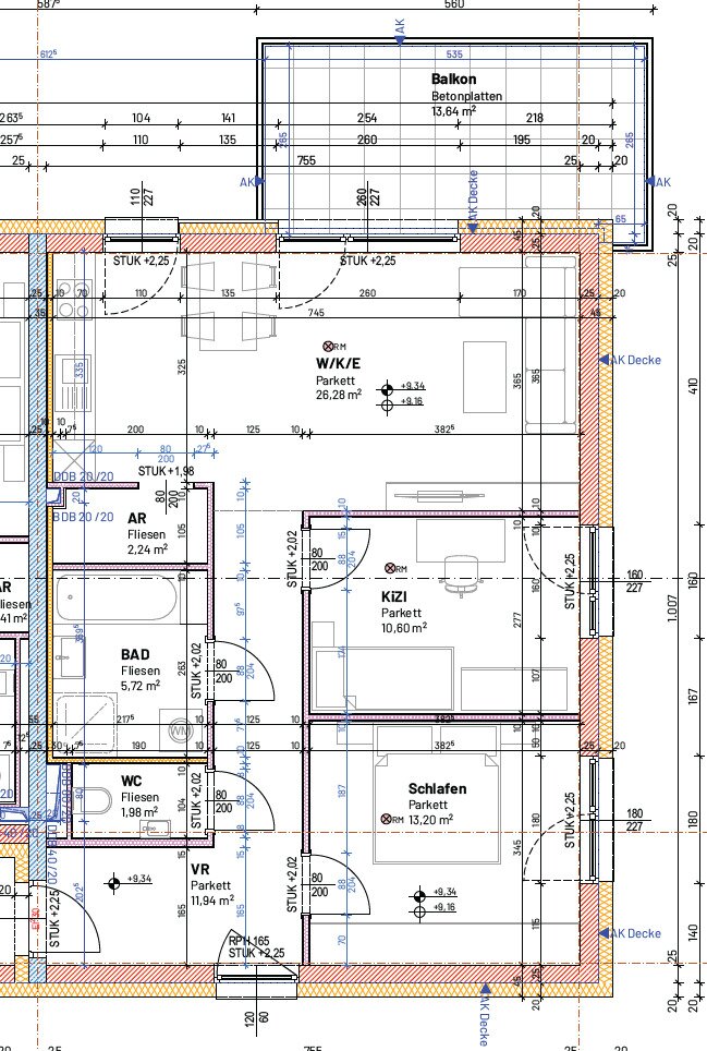 - Vorraum - Wohn/Ess/Küche - Bad mit Badewanne - separates WC - Abstellraum - Schlafzimmer - Kinderzimmer/Büro - Balkon