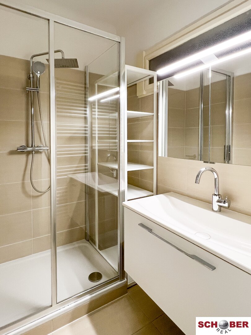 modernes Badezimmer mit Glasdusche und Handtuchwärmer