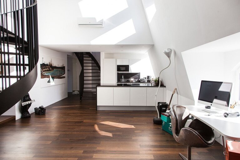 Die Wohnung kann idealerweise in einen Arbeits- und Wohnbereich geteilt werden und wird bis auf Küche und Bäder unmöbliert vermietet.