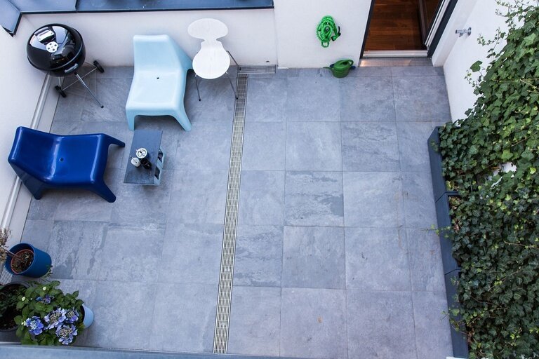 - Terrasse: Verlegung von einem dunkelgrauen Stein 60 x 60 cm