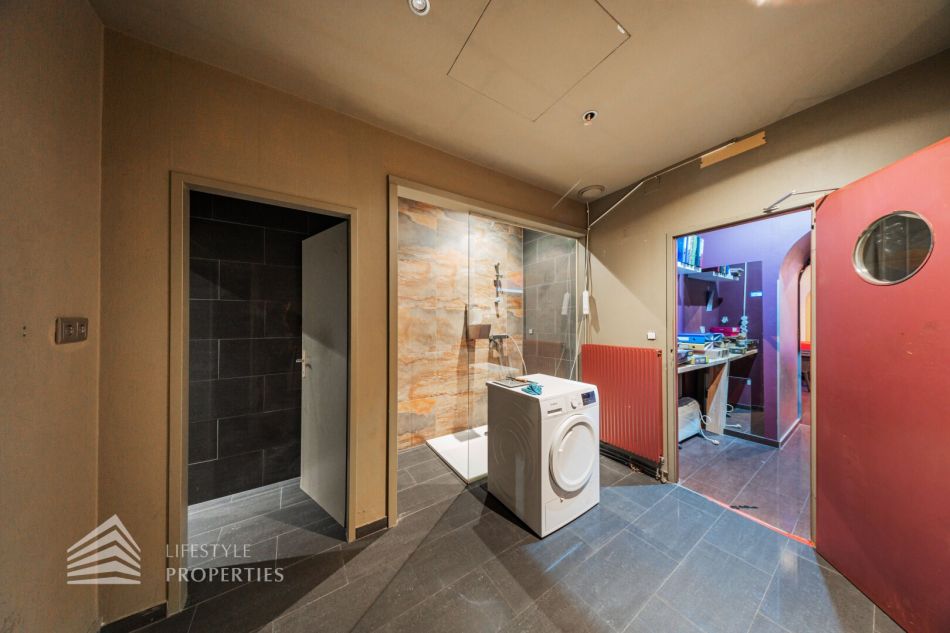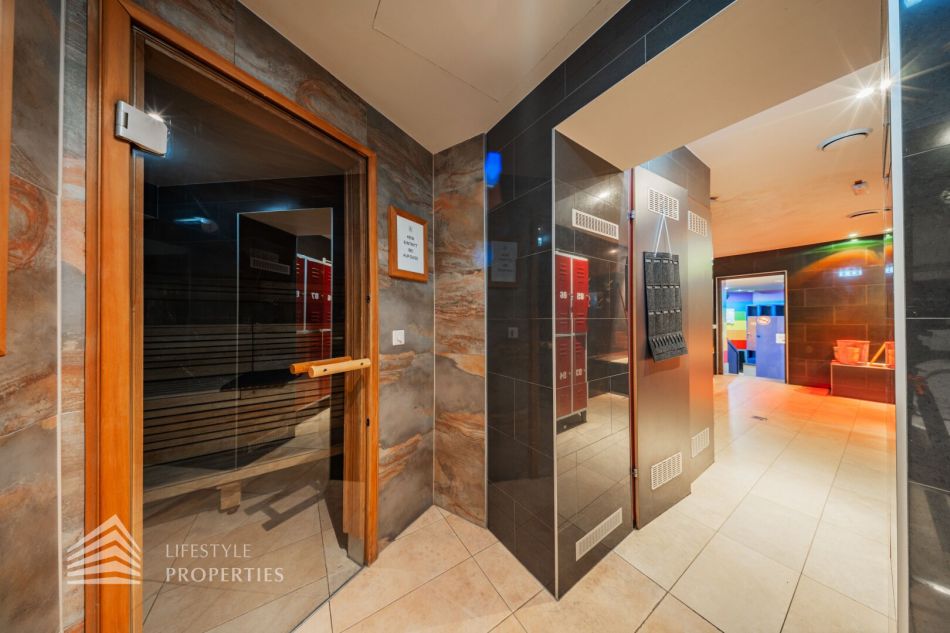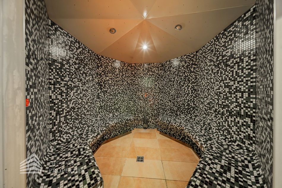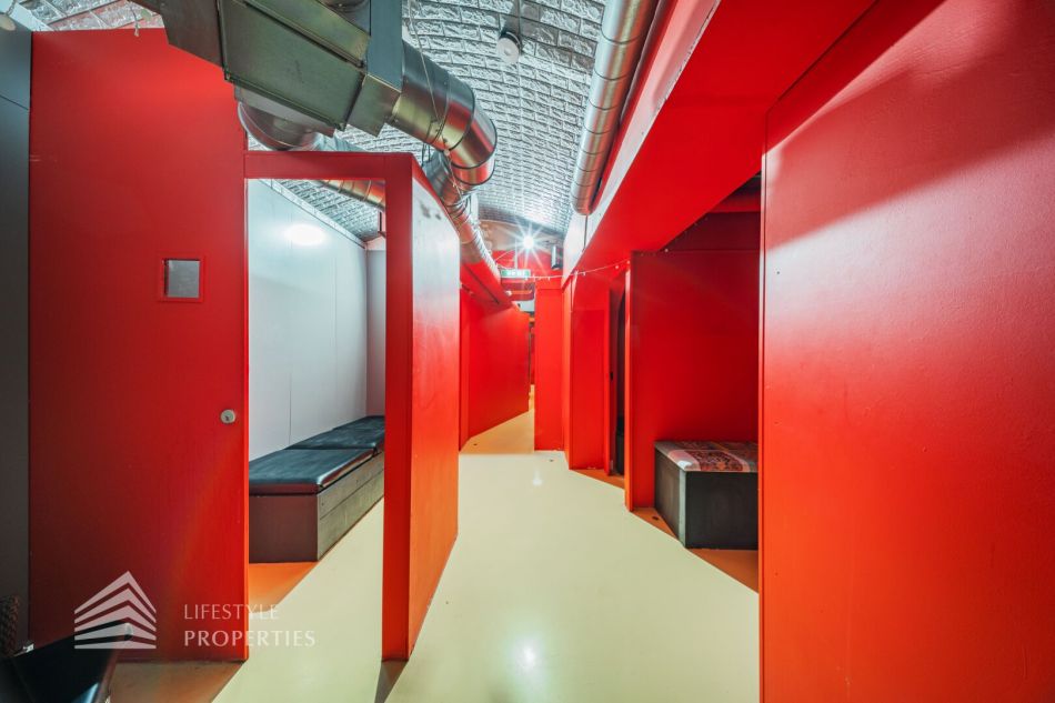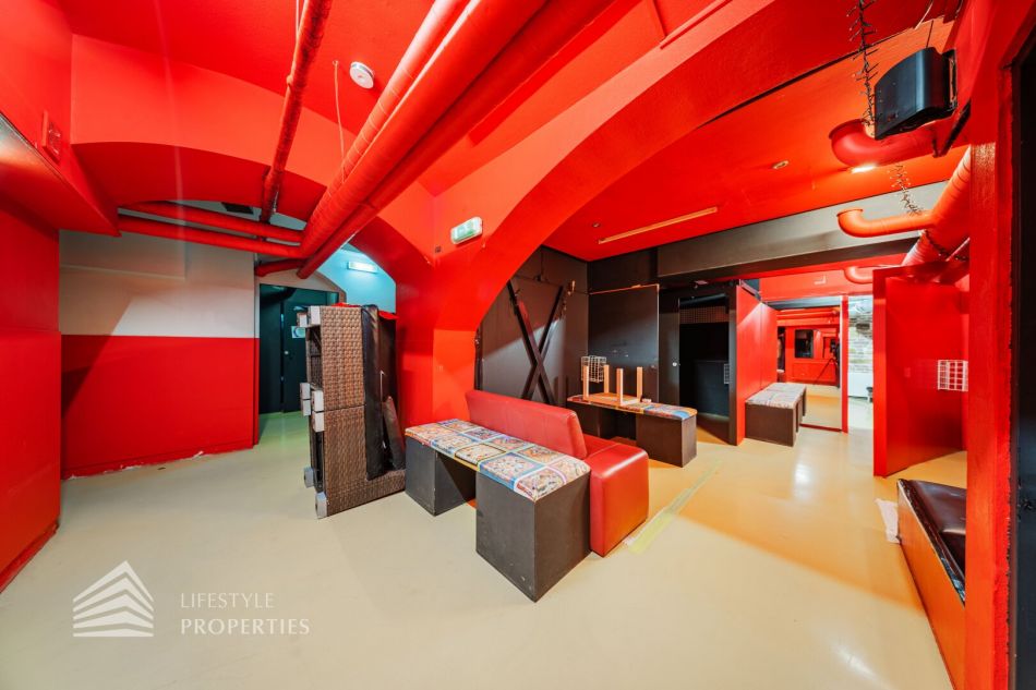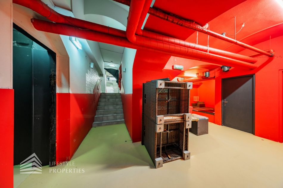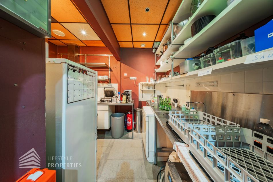 Das Objekt verfügt über eine vollausgestattete Küche mit Bar sowie über einen Saunabereich mit einer Finnischen Sauna und einem Dampfbad als auch einen Ruheraum. Des Weiteren gibt es geteilte Garderoben mit verschließbaren Spinten und ausreichend Duschen. Den Fitnessbereich kann man sowohl im Souterrain als auch im Keller auf verschiedene Flächen aufteilen. Es gibt auch abgetrennte Räume, diese sich für ein Solarium eignen.