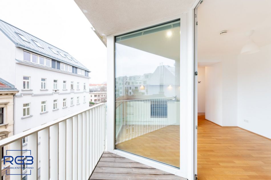 Von hier aus geht es hinaus auf die ca. 3,5 m² große Loggia, die nach Südwesten ausgerichtet ist. Ein herrlicher Platz für den ersten Kaffee am Morgen oder ein Glas Wein am Abend – mit Blick über die Dächer und viel Himmel.