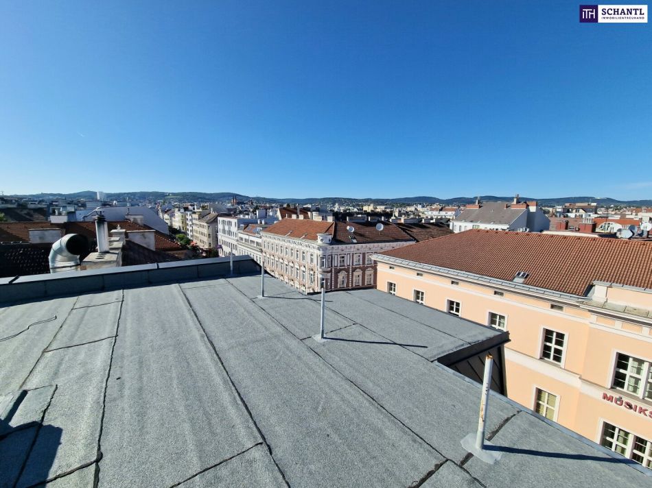 Das Herzstück der Wohnung bildet der lichtdurchflutete Wohn- und Essbereich, der durch seine offene Gestaltung und die großen Fensterflächen eine besonders einladende Atmosphäre schafft. Hier genießen Sie nicht nur stilvolles Ambiente, sondern auch direkten Zugang zu den zwei Balkonen und der Dachterrasse, die einen traumhaften Ausblick über die Dächer der Stadt bietet.