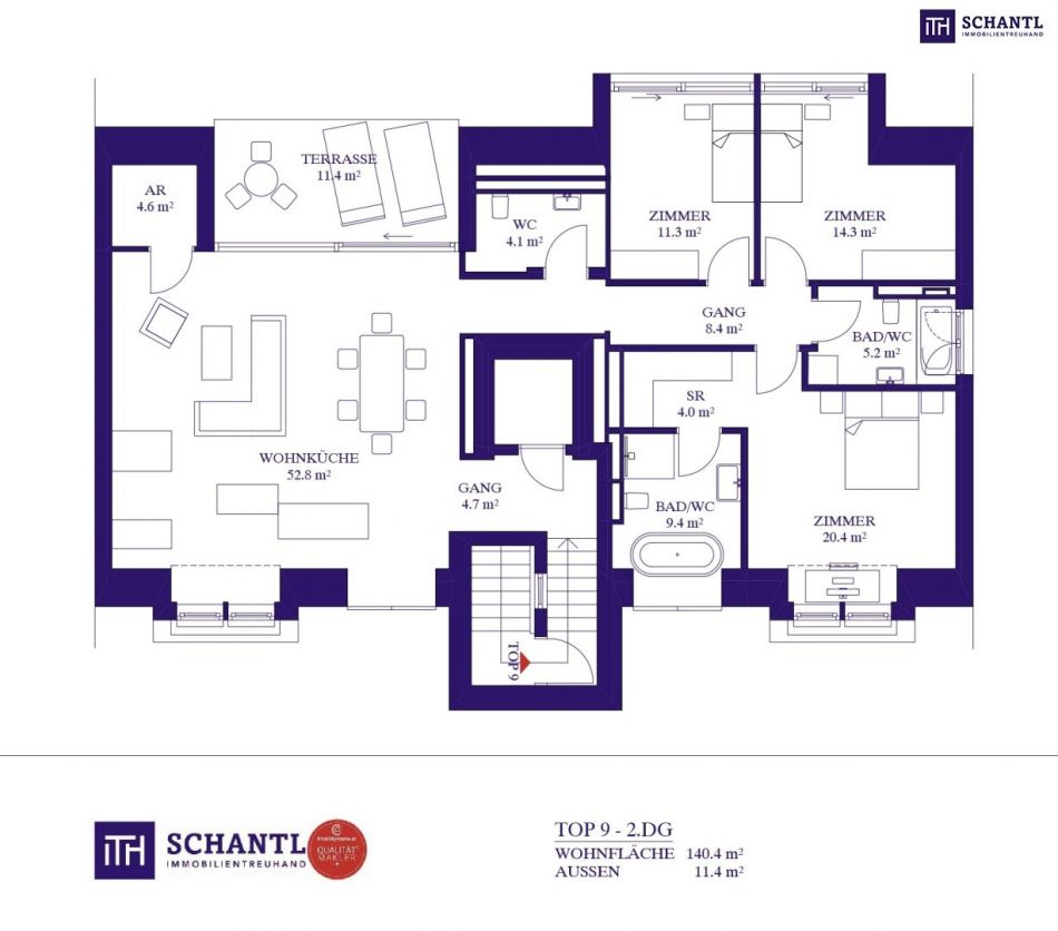 Wohnfläche: ca. 140,4 m² + Terrasse: ca. 11,4 m² + Kellerabteil