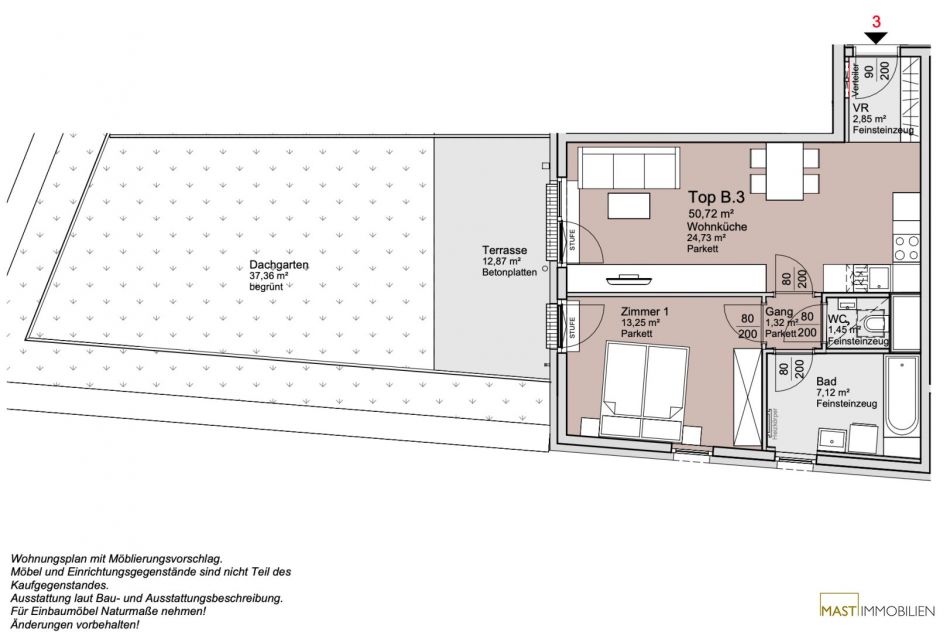 Die Wohnung befindet sich im 1. Liftstock und verfügt über 50,72 m² Wohnfläche + eine 12,87 m² große Terrasse + ein 37,36 m² großer Dachgarten .