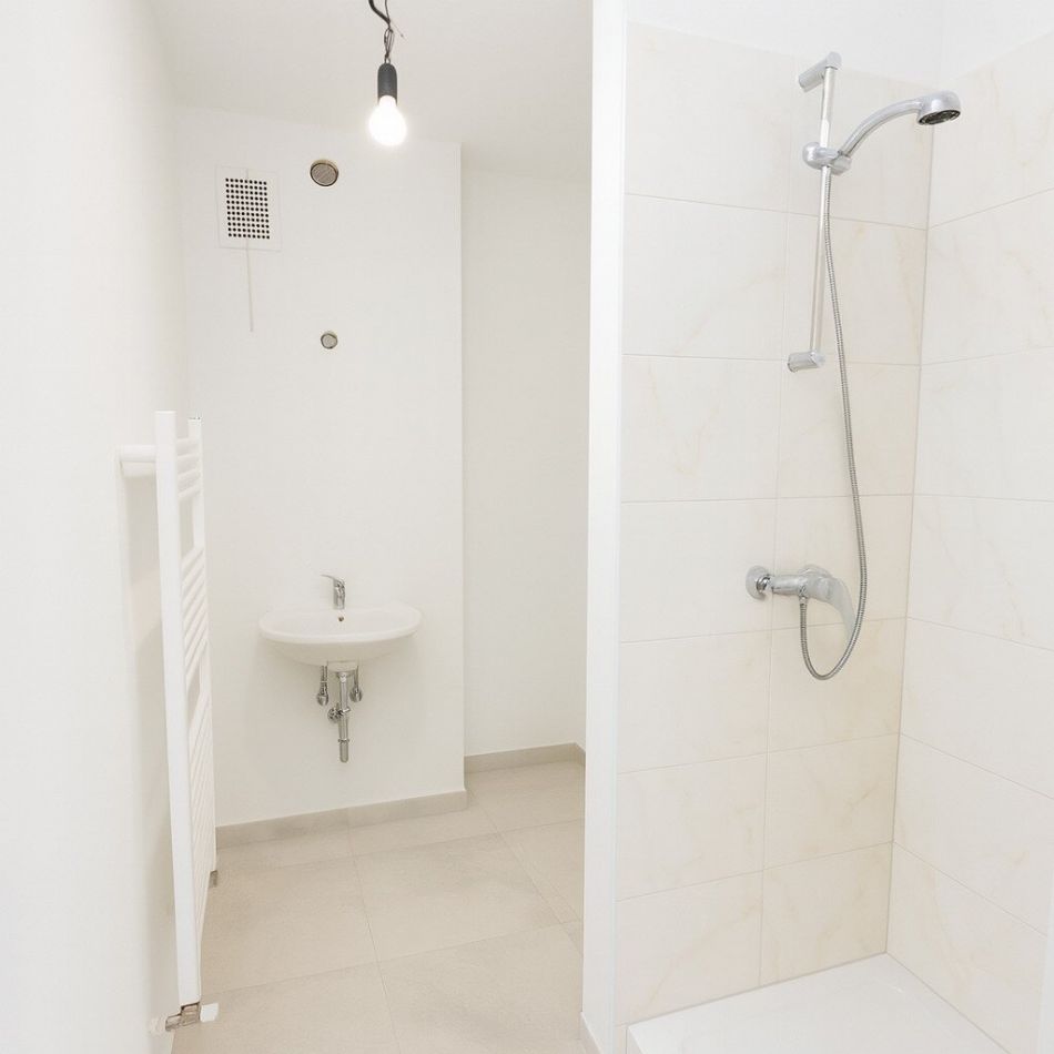 Badezimmer mit Dusche und Waschmaschinenanschluss