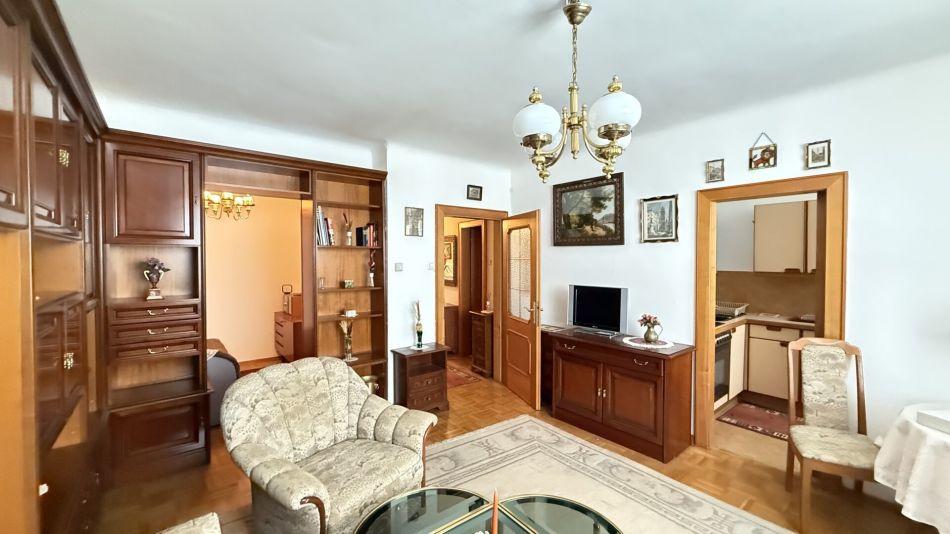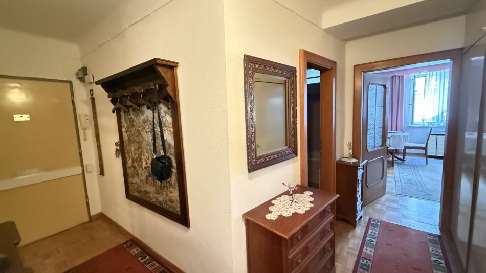 Die Wohnung gliedert sich auf ein Schlafzimmer (Kabinett) und ein Wohnzimmer, separate Küche, Bad mit Badewanne und WC zusammen, Vorzimmer mit Einbauschränken mit einer Garderobe. Die Küche ist durch das Wohnzimmer zu begehen und hat ein Fenster nach Außen. Sie beinhaltet einen Herd mit Backrohr, Kühlschrank und Tiefkühlfach, sowie eine Dunstabzugshaube. Die Zimmeraufteilung ist sehr gut gelungen. Vom Wohnzimmer gelangen Sie auch zur Schlafnische / Schlafzimmer (Kabinett). Es ließe sich auch ein eigener Zugang zum Schlafzimmer machen durch Umbau. Die Wohnräume sind mit Parkett und die Nassräume mit Vinylboden verlegt. Fenster mit Zweifachverglasung und Innenjalousien. Die Wohnung ist außerdem hell und geräumig durch die gelungene Raumaufteilung. Sie befindet sich im Ersten Liftstock. Zu Ihrer Sicherheit wurde noch zusätzlich ein Balkenriegel bei der Eingangstüre eingebaut. Geheizt wird mittels Gas (Gaskonvektoren) die sehr effizient sind. Für die Warmwasseraufbereitung sorgt der Durchlauferhitzer. Ein eigenes Kellerabteil ist der Wohnung als Zubehör zugeordnet.