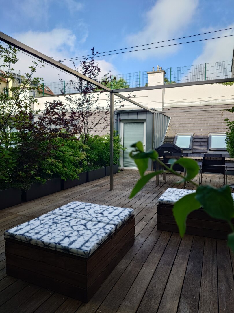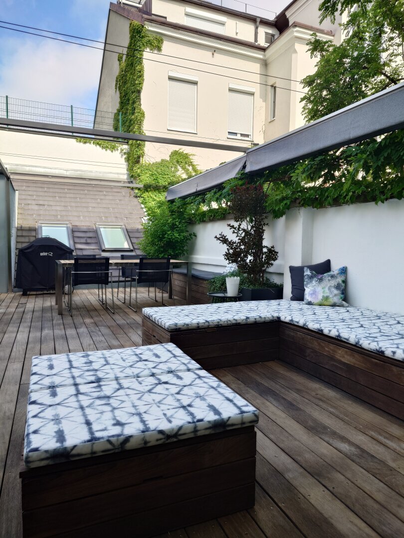 Von der Wohnküche aus gelangt man auf die ruhige und sehr sonnige, südwestseitig ausgerichtete Terrasse, welcher der Altbauwohnung Unikats-Charakter verleiht. Die Terrasse ist mit maßgefertigten Pflanztrögen, Holzmöbeln und indirekter Beleuchtung ausgestattet.