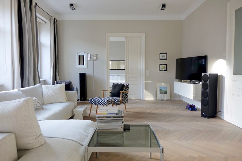 Elektro-Installation für versteckte TV-Kabel im Wohnzimmer sowie für versteckte Lautsprecherkabel in Wohnzimmer, Wohnküche und Schlafzimmer
