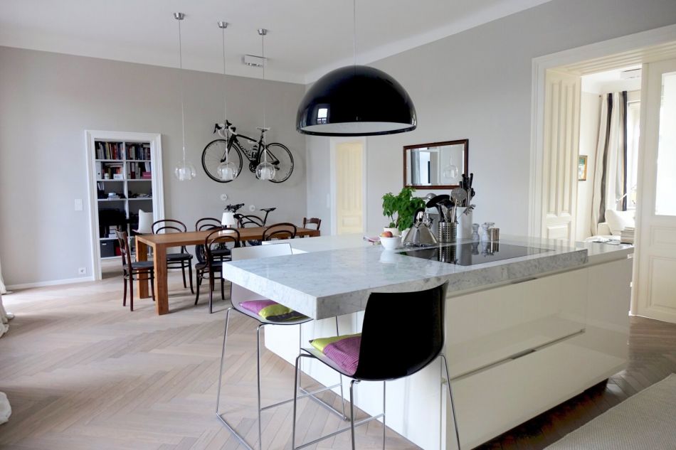 Durch eine Doppelflügeltür gelangt man in die großzügige Wohnküche, die mit einer luxuriösen Designer-Küche von Varenna sowie hochwertiger Deckenbeleuchtung ausgestattet wurde.