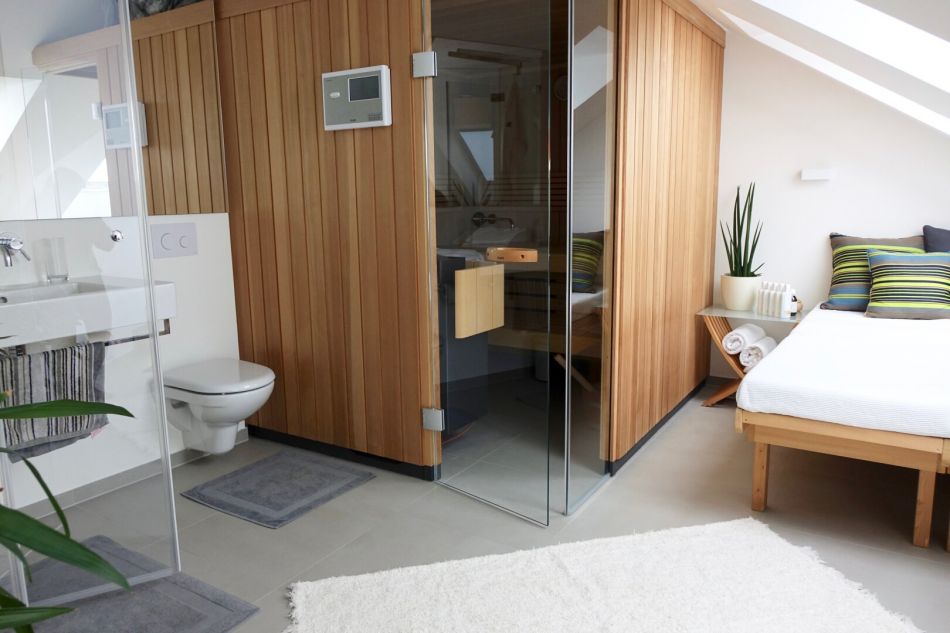 Über die Terrasse kann ein weiteres Highlight der Wohnung erreicht werden: der Wellnessbereich, welcher mit einer KLAFS Sauna, Waschbecken, Dusche und WC ausgestattet wurde und über einen Liegebereich verfügt.