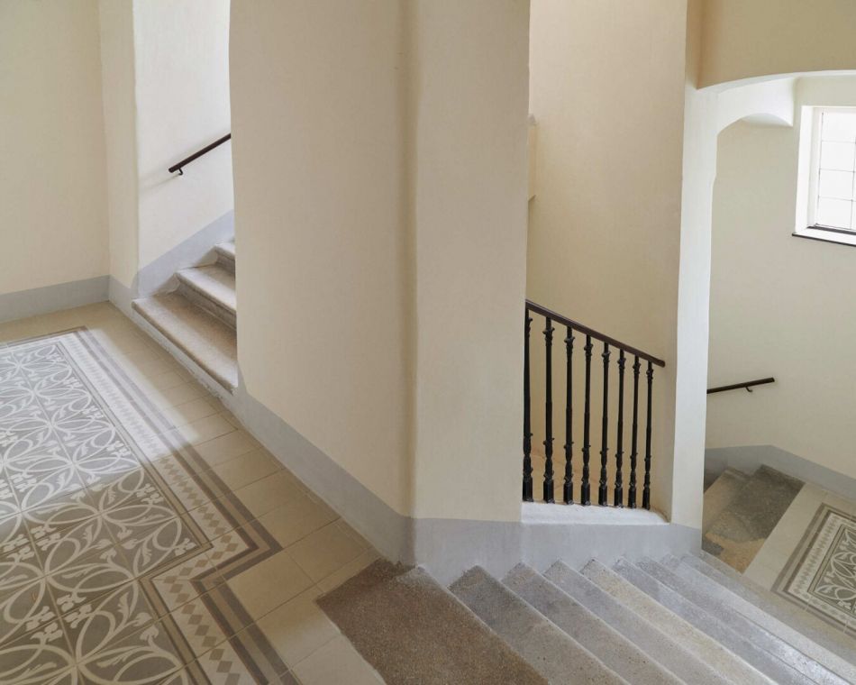 Neu gestaltetes Stiegenhaus mit frischer Ausmalung zur Betonung des Altbaucharakters