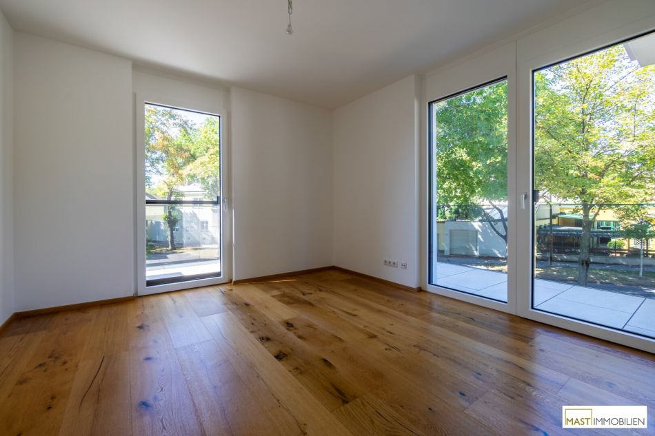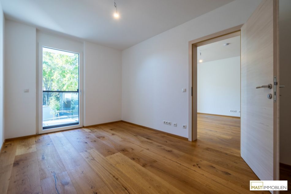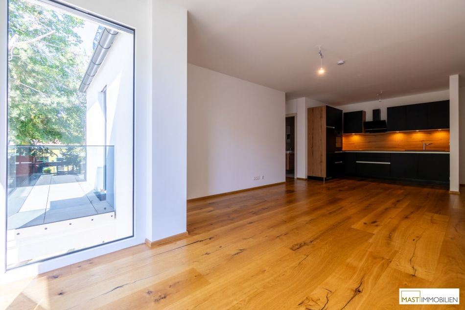 Nach Eintritt in die Wohnung gelangen Sie durch den Vorraum in einen großzügigen Wohn- & Speisebereich, veredelt mit einer hochwertigen Küche inkl. Geräte. Die zwei Schlafzimmer verfügen über eine Fläche von rund 12 m² und 13 m² und bieten jeweils einen eigenen Balkon. Das größere Schlafzimmer hat sogar noch einen zweiten Balkon! Das Bad wurde mit einer Dusche und Waschbecken ausgestattet. Das WC mit Waschbecken ist natürlich vom Badezimmer getrennt begehbar. Zusätzlich wurde diese Wohnung mit einem Abstellraum ausgestattet. Ein Kellerabteil ist im Mietpreis ebenfalls inkludiert. Ein Stellplatz in der Garage kann optional angemietet werden.