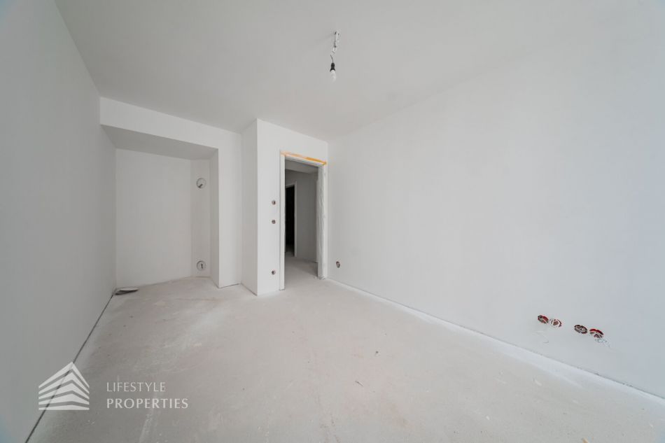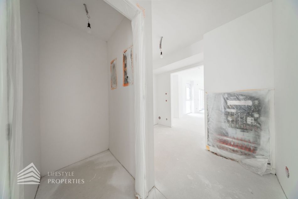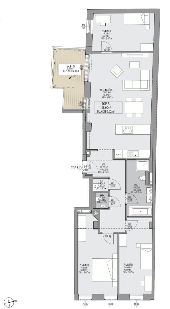 Sie betreten die Wohnung und befinden sich im Vorraum. Links gelangen Sie in eine großzügige Wohnküche mit Anschlüssen für eine offene Küche von hier haben Sie Zugang zum schönen Balkon. Gleich neben der Wohnküche befindet sich eines der Zimmer. Beim Eingang rechts gelangen Sie zu den zwei anderen Schlafzimmern. Der Abstellraum mit Waschmaschinenanschluss und das Badezimmer welches mit einer Badewanne, einer Dusche, einem Doppelwaschbecken und einem WC ausgestattet ist, sowie ein separates WC befinden sich im Vorraum.