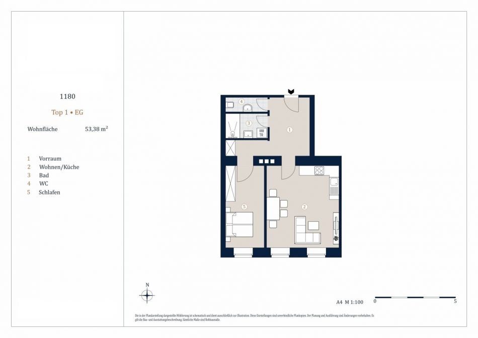 Sie ist ein Erstbezug und befindet sich im EG eines in der Jahrhundertwende erbauten Altbaus. Die Wohnung verfügt über eine Größe von ca. 53 m² und gliedert sich in einen Vorraum, eine Wohnküche, ein Zimmer, ein Bad und ein WC. Die Wohnräume sind mit schönem Parkett ausgestattet, die Nassräume sind verfliest. Beheizt wird mittels Fußbodenheizung.