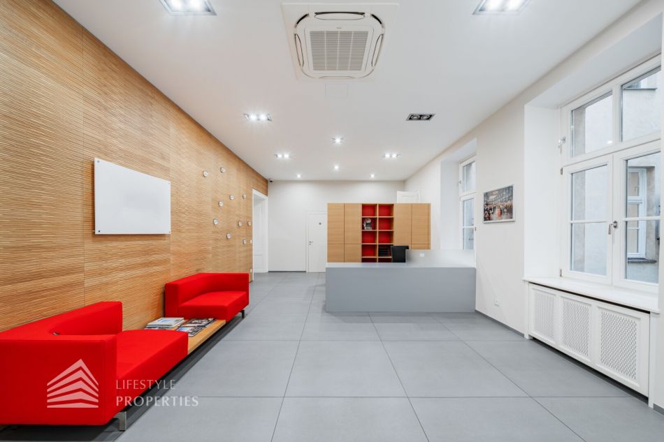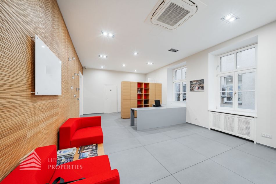 Das Büro befindet sich im zweiten Obergeschoss eines im Jahre 1850 erbauten, charmanten Altbaus. Die ca. 174 m² Fläche teilen sich auf in vier Büroräume, einen Empfangsraum und einer Küche. Das Büro ist durchwegs mit hochwertigem Parkett und exklusiven Fliesen ausgekleidet. Alle Räume sind klimatisiert und mit Kameras ausgestattet.