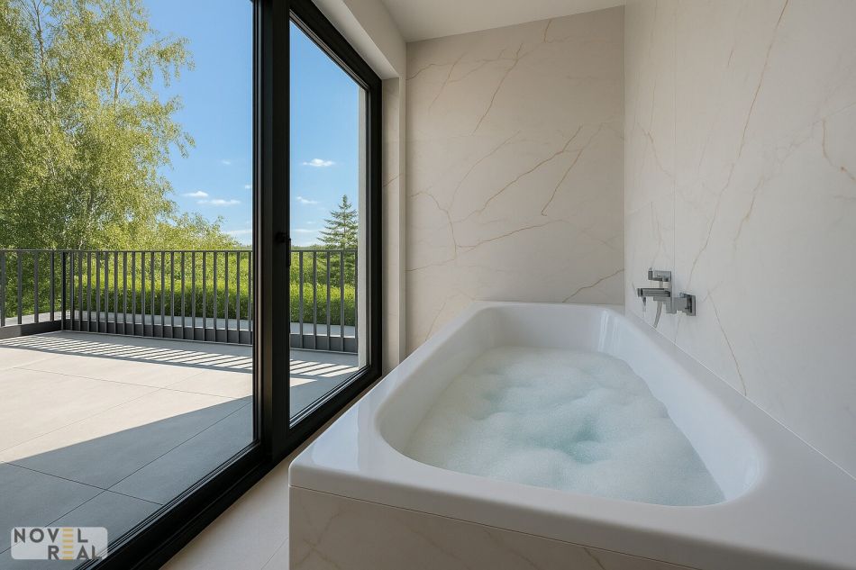 Badezimmer ausgestattet mit Badewanne, Dusche, Doppelwaschbecken und einer Toilette sowie einem Ausgang auf eine der Terrassen
