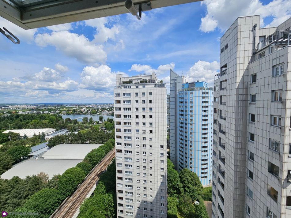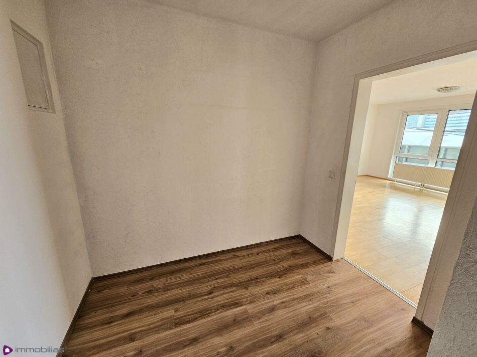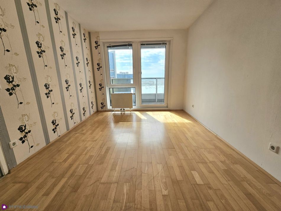 Wohnküche mit kleiner Einbauküche (baulich abgetrennt, Küchennische), mit Ausgang auf die Loggia, Ausrichtung Südost/ Blick zur UNO City