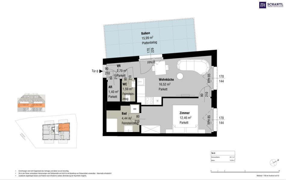 Wohnfläche: ca. 39,11m² + Balkon: ca. 15,99m² + Kellerabteil