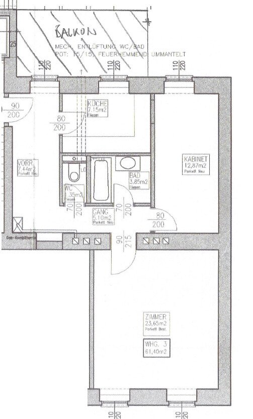 Die Wohnung befindet sich im 1. Stock eines in der Jahrhundertwende erbauten Altbaus und verfügt über eine Größe von ca. 61 m². Diese gliedert sich in einen Vorraum, eine Küche, zwei Zimmer, ein Bad und ein separates WC. Die Wohnräume sind mit schönem Parkett ausgestattet, die Nassräume sind verfliest.