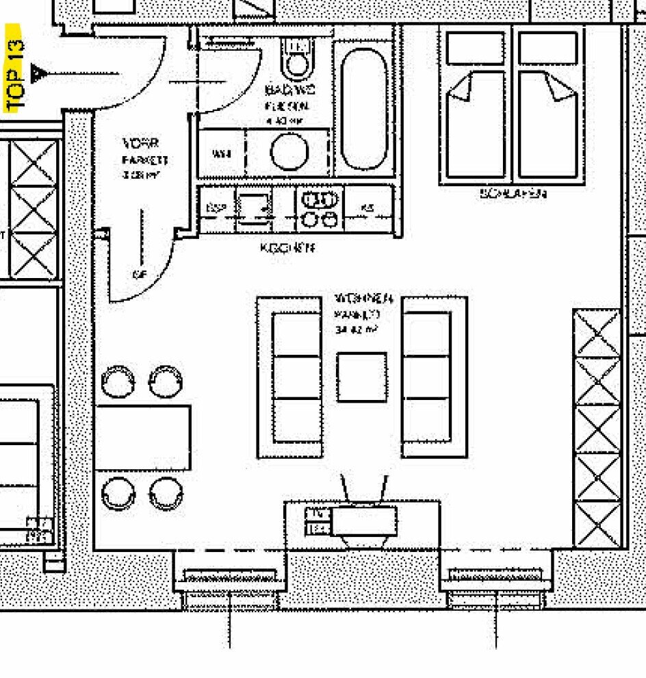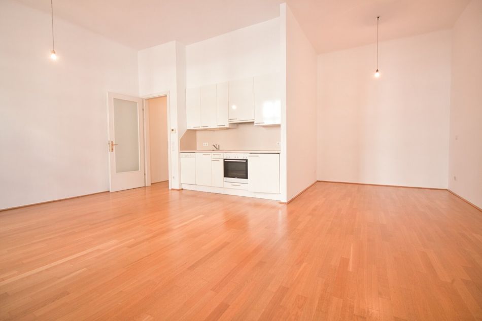 Der Vorraum dieser Wohnung bietet viel Platz zum Ankommen und für eine Garderobe. Er bietet Zugang zum Badezimmer mit großem Waschtisch, Dusche und dem WC sowie zum großzügigen Wohn-/Schlafzimmer, welches in Richtung der ruhigen Laurenzgasse hin situiert ist. Die Küche bietet ausreichend Platz und ist vollausgestattet.