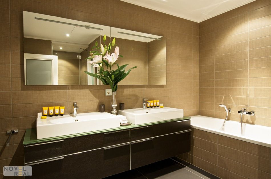 Jedes Schlafzimmer verfügt über ein eigenes, hochwertig ausgestattetes Badezimmer mit Badewanne, Waschbecken und WC. Die Verwendung von Naturstein und edlen Armaturen unterstreicht den luxuriösen Charakter.