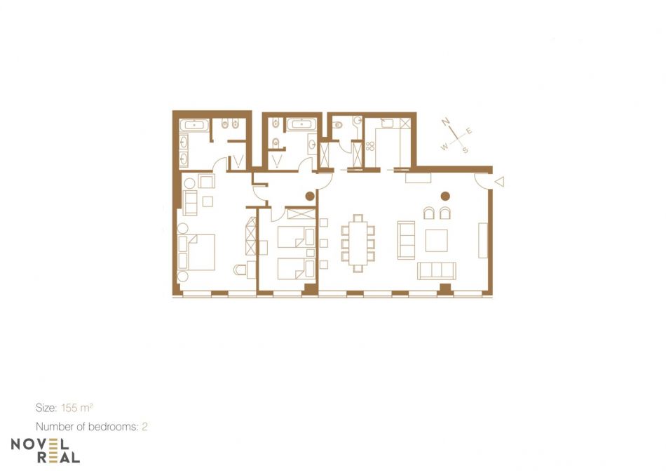Zwei luxuriös ausgestattete Badezimmer, eine separat gehaltene Küche sowie zwei einladende Schlafzimmer vervollständigen den repräsentativen Wohnbereich und unterstreichen den exklusiven Charakter dieser besonderen Einheit.