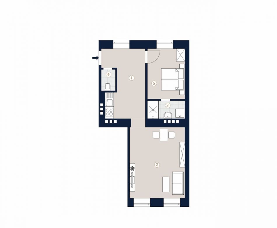 Sie betreten die Wohnung und befinden sich im Vorraum, geradeaus befindet sich das Schlafzimmer mit en-suite Badezimmer welches mit einer Dusche und einem Handwaschbecken ausgestattet ist. Beim Vorraum rechts befindet sich die Küche, durch welche Sie in das Wohnzimmer gelangen. Die separate Toilette befindet sich im Vorraum.