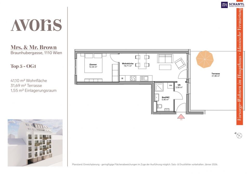 Wohnfläche: ca. 41,10m² + Terrasse: ca. 31,96m² + Kellerabteil: ca. 1,55m²