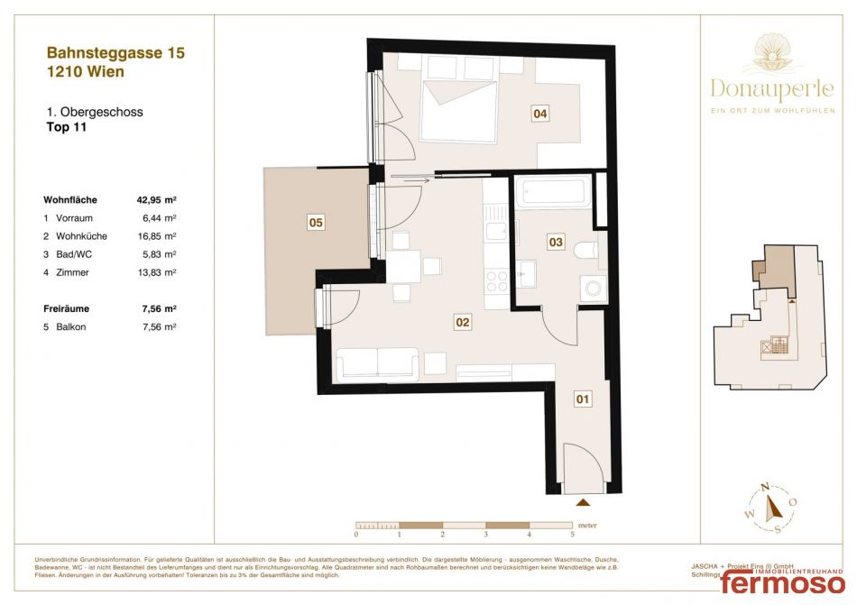In der modernen Donau Perle in der Bahnsteggasse 15 erwartet Sie diese perfekt geschnittene 2-Zimmer-Wohnung mit ca. 42,95 m² Wohnfläche und einem sonnigen Balkon (7,56 m²). Ideal für Singles oder Paare, die modernes Wohnen mit hoher Lebensqualität verbinden möchten.