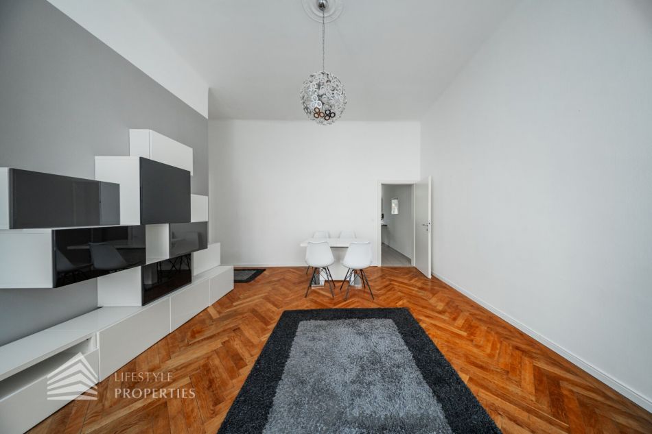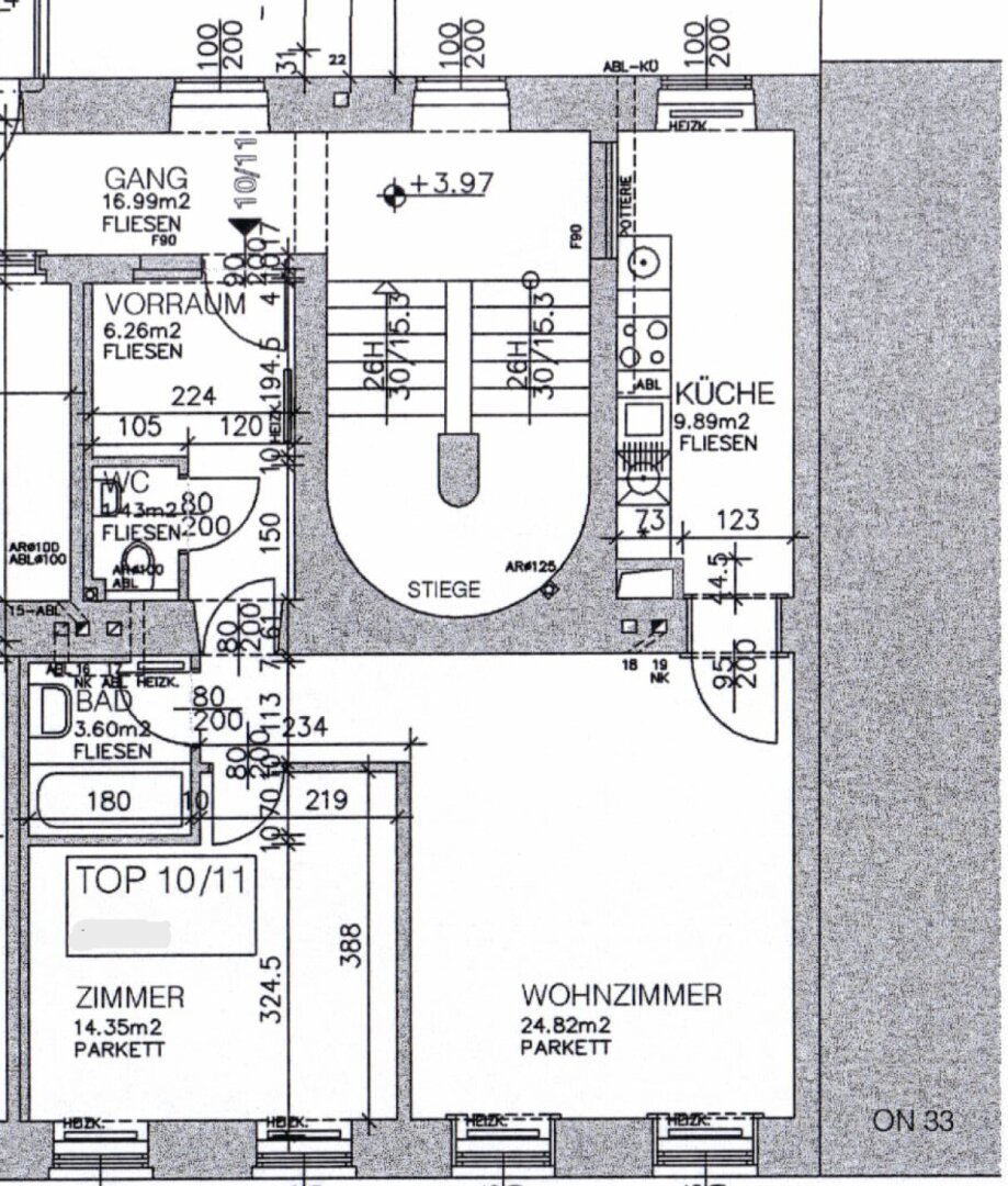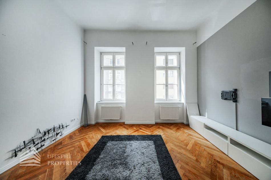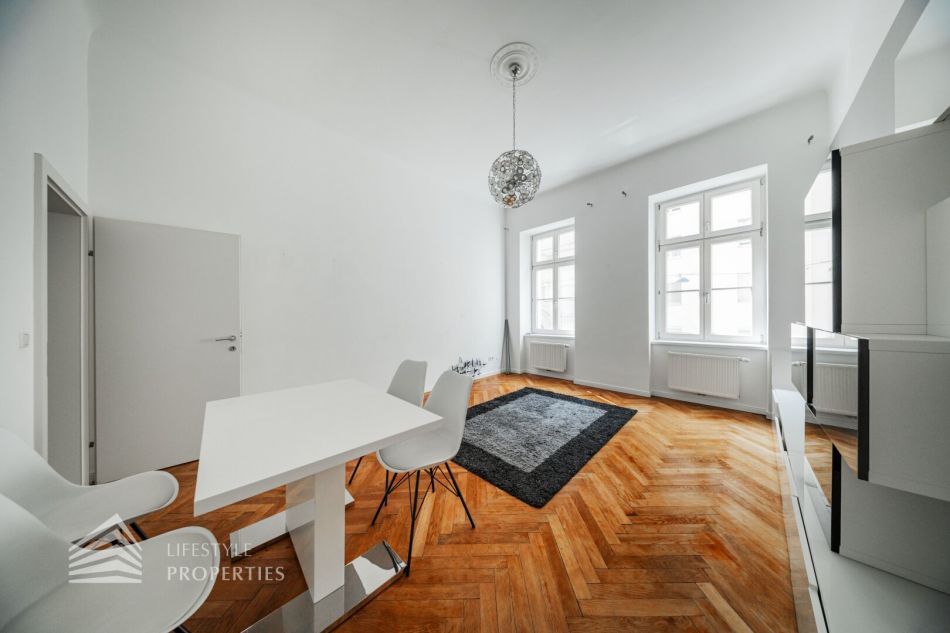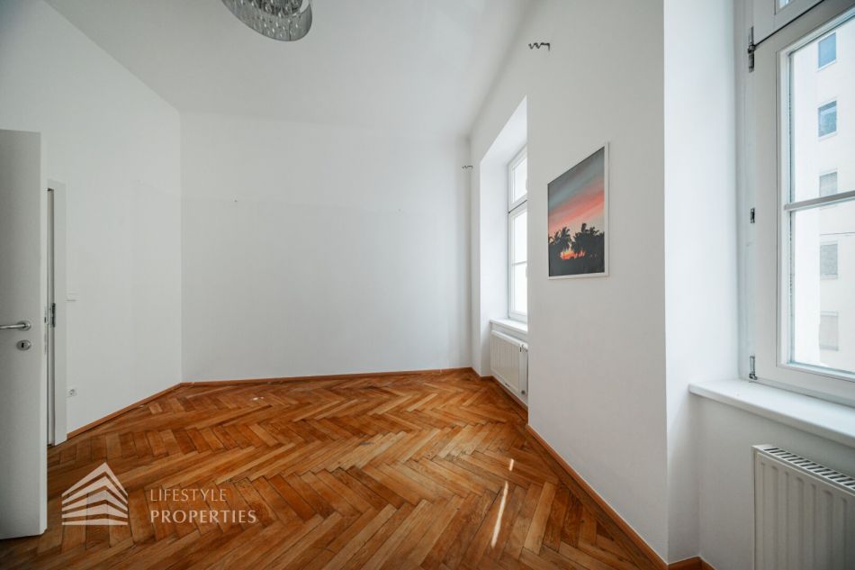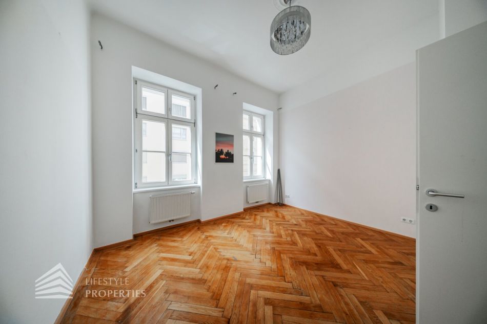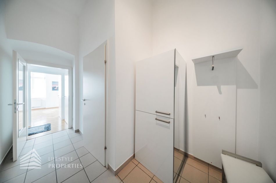 Die Wohnung befindet sich im 1. Stock eines im Jahre 1900 errichteten Altbaus und ist bequem mit einem Lift zu erreichen. Die Wohnfläche von ca. 60 m² gliedert sich in einen Vorraum, ein Wohnzimmer, ein Schlafzimmer, eine Küche, ein Badezimmer und ein separates WC. Die Wohnräume sind mit einem schönen Parkett ausgestattet. Das Bad, der Vorraum und das WC sind mit Fliesen verlegt. Ein Kellerabteil sowie ein Kinderwagen- und Fahrradraum stehen ebenfalls zur Verfügung.