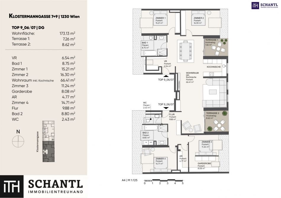 Wohnfläche: ca. 174,06m² + 1.Terrasse: ca. 7,26m² + 2.Terrasse: ca. 8,62m² + Dachterrasse: ca. 45,40m² + Kellerabteil: ca. 6,08m²