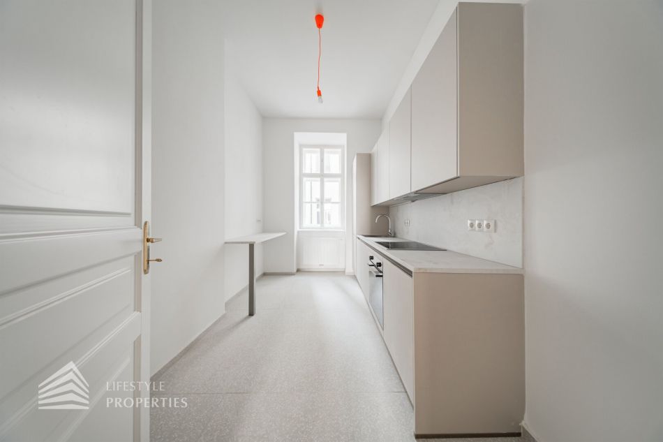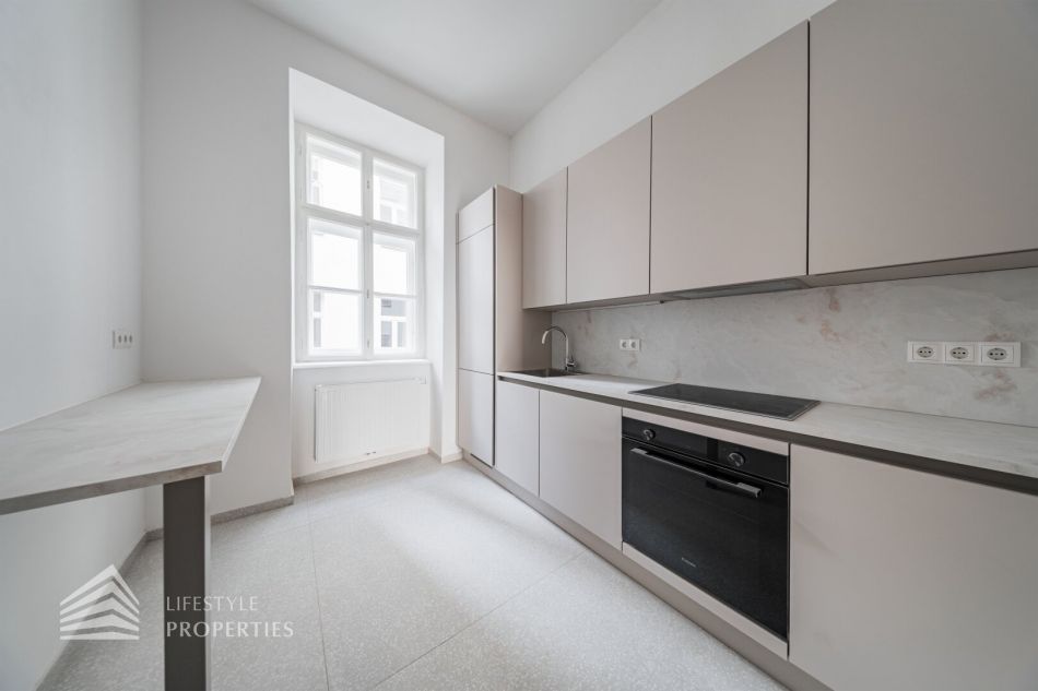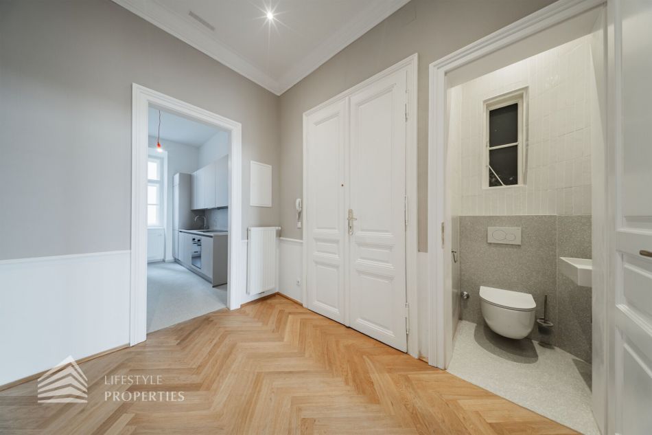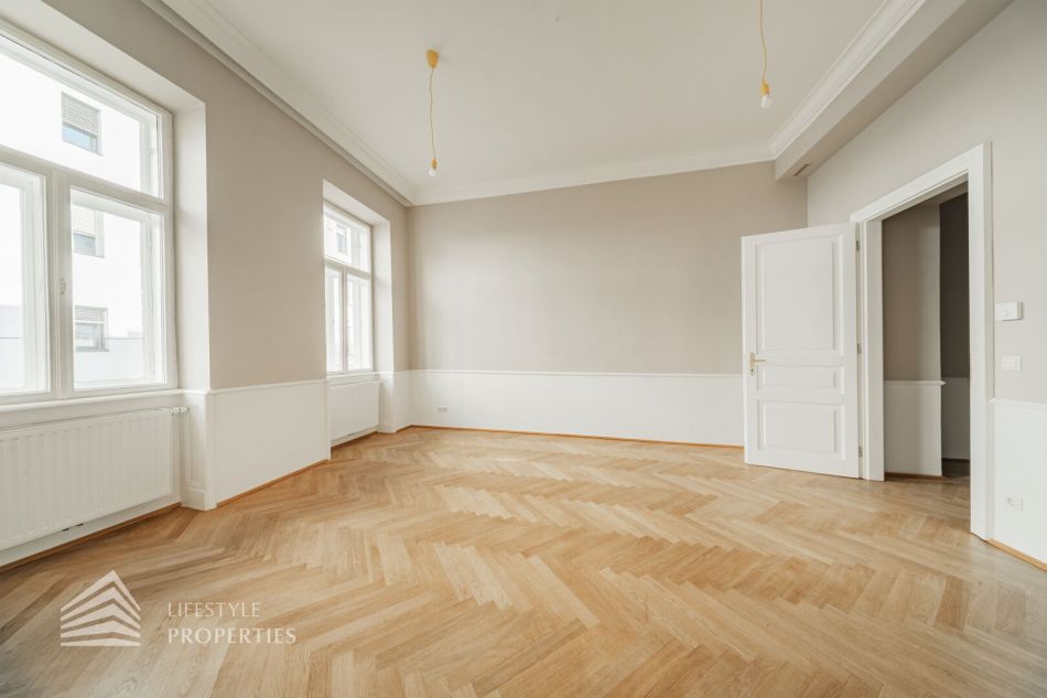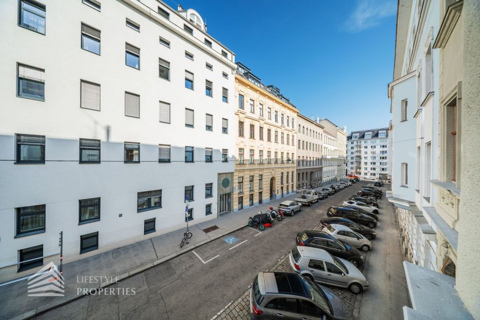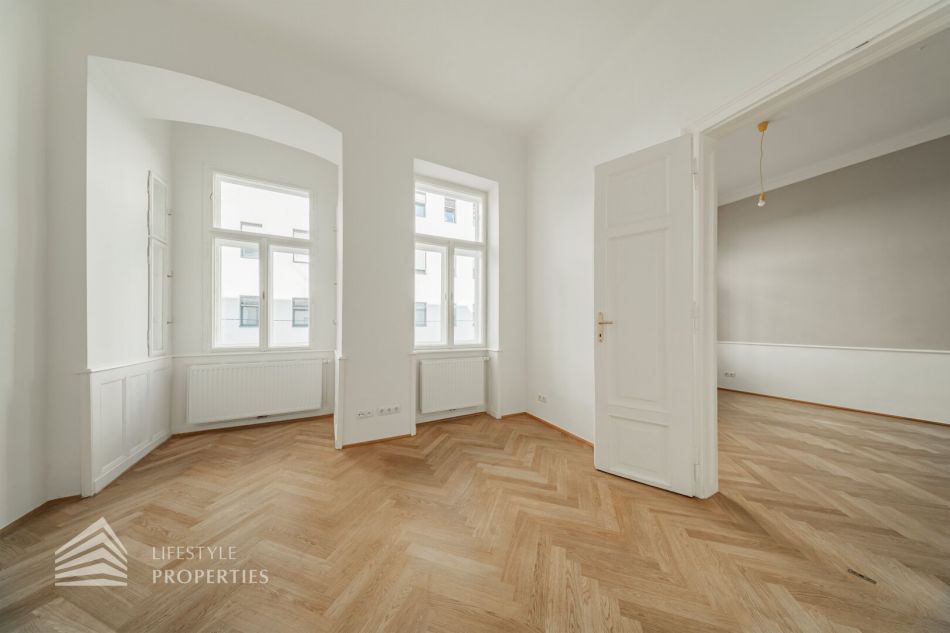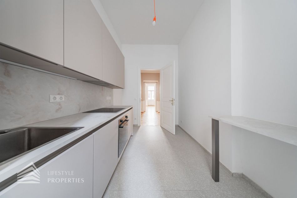 Vom zentralen Eingangsbereich mit Vorraum befindet sich auf der rechten Seite die bereits eingebaute Küche sowie das Gäste WC. Die beiden Zimmer sind wie im klassischen Altbau üblich hintereinander angeordnet. Der großzügige Wohnraum bietet ausreichend Platz für eine gemütlche Sofalandschaft sowie Essbereich. Von hier gelangt man in das Schlafzimmer inkl. direkt verbundenem Badezimmer. Das Masterbadezimmer ist hochwertig ausgestattet.