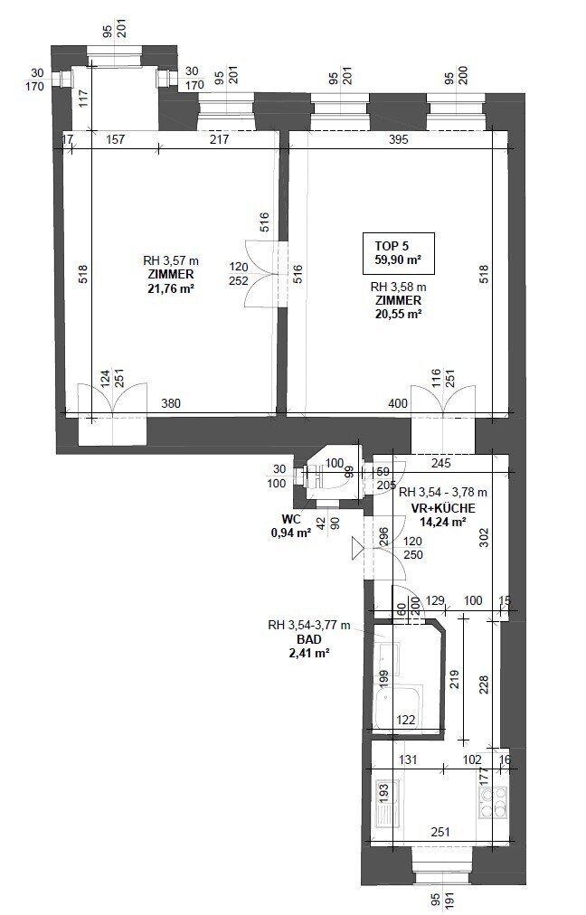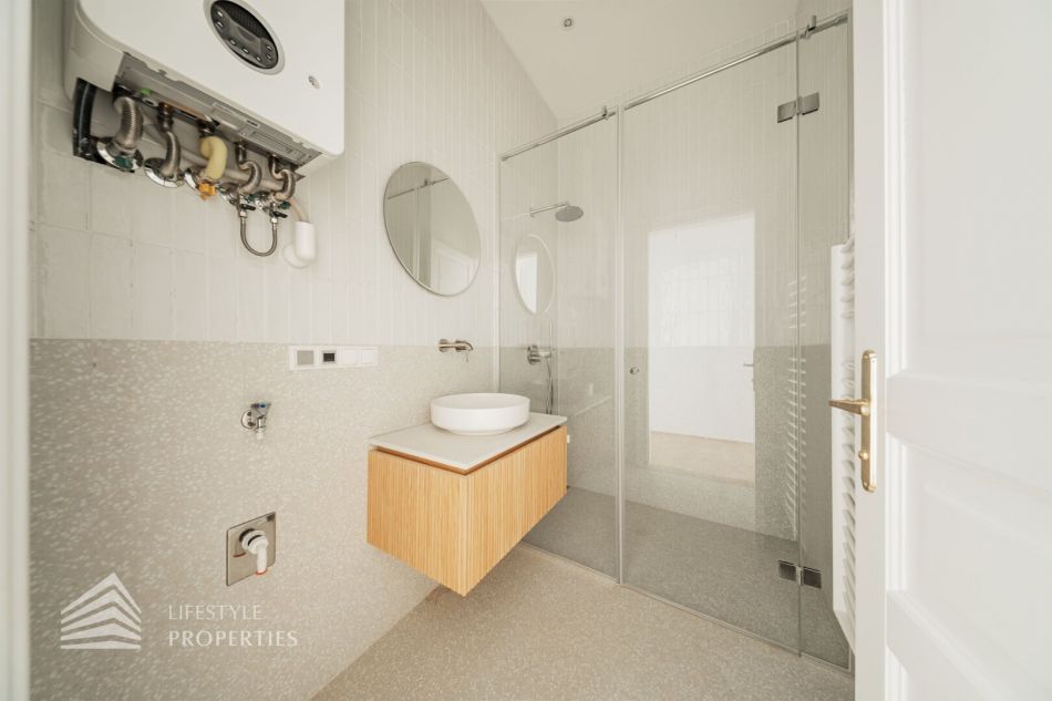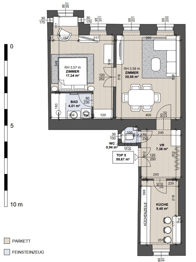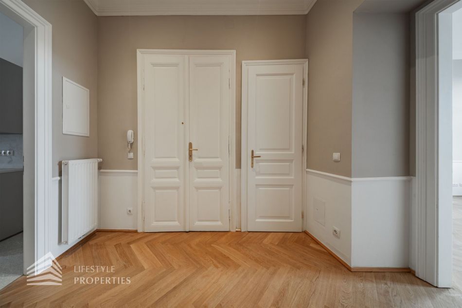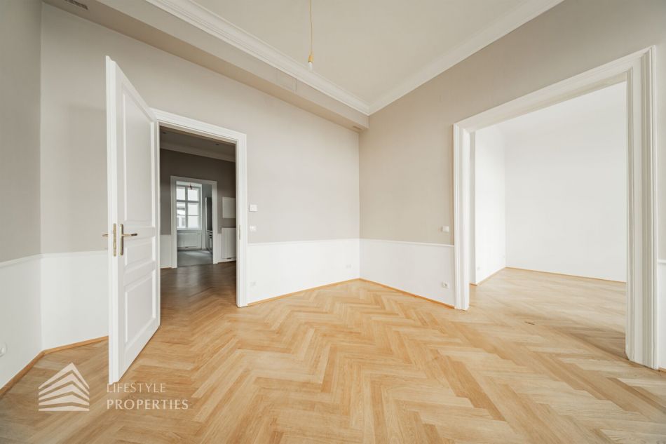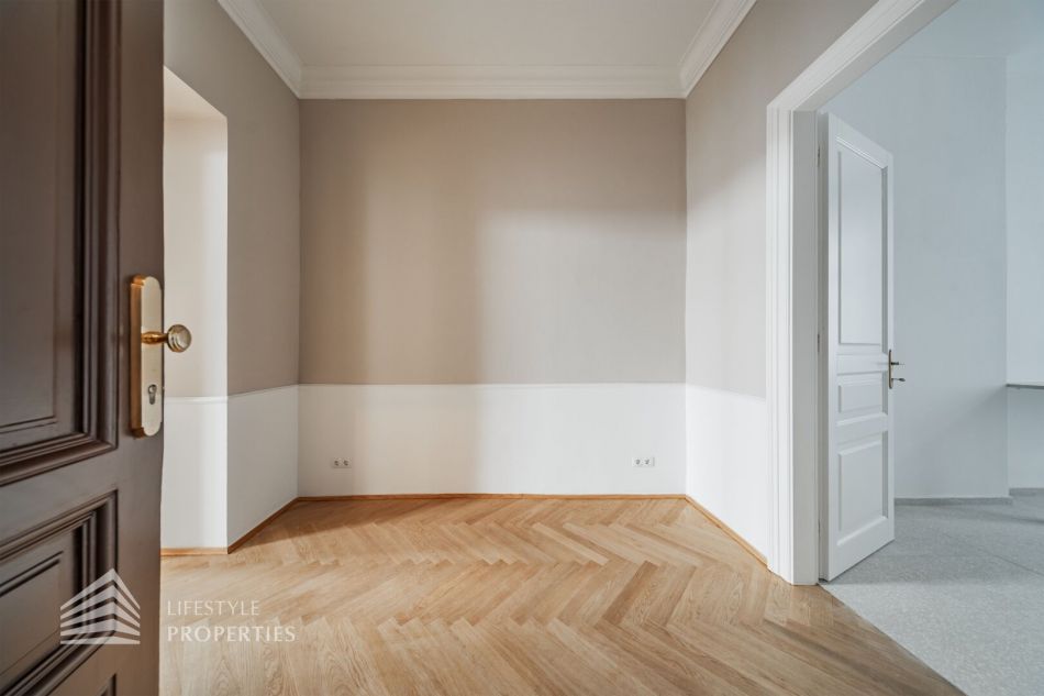 Vom zentralen Eingangsbereich mit Vorraum befindet sich auf der rechten Seite die bereits eingebaute Küche sowie das Gäste WC. Die beiden Zimmer sind wie im klassischen Altbau üblich hintereinander angeordnet. Der großzügige Wohnraum bietet ausreichend Platz für eine gemütlche Sofalandschaft sowie Essbereich. Von hier gelangt man in das Schlafzimmer inkl. direkt verbundenem Badezimmer. Das Masterbadezimmer ist hochwertig ausgestattet.