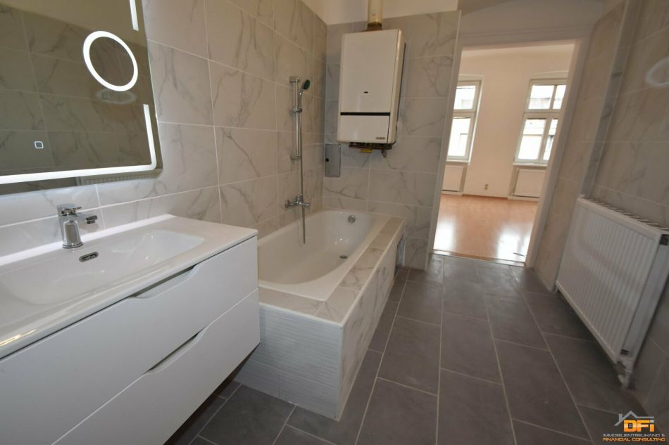 Das Badezimmer wurde vor Kurzem saniert und verfügt neben einer Wanne auch über eine Dusche und einen Waschmaschinenanschluss.