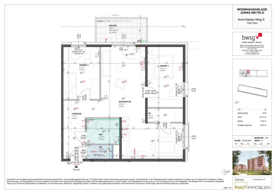 Die Wohnung befindet sich im 7. OG und verfügt über 74,57 m² Wohnfläche + einen 7,06 m² großen Balkon.